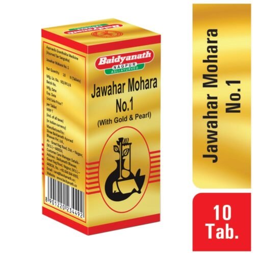 Baidyanath Jawahar Mohra No.1 SMAY is a classical Ayurvedic formulation prepared using precious herbs and minerals to support heart health, mental calmness, and overall vitality. Traditionally used as a Rasayan (rejuvenator), this potent supplement is known to help in managing stress, palpitations, anxiety, and general debility.