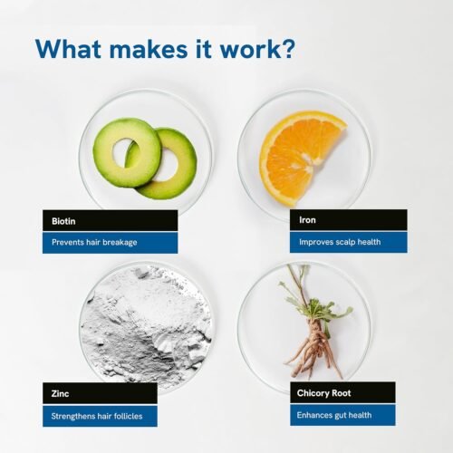 - Zinc: Encourages hair follicle health and reduces hair thinning.