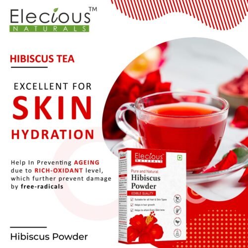 Elecious Hibiscus Powder is a 100% natural and versatile beauty and wellness product, packed with antioxidants, vitamins, and essential nutrients. It promotes healthy hair growth, strengthens roots, and prevents dandruff while enhancing skin radiance. Additionally, it can be brewed as a refreshing and health-boosting hibiscus tea.