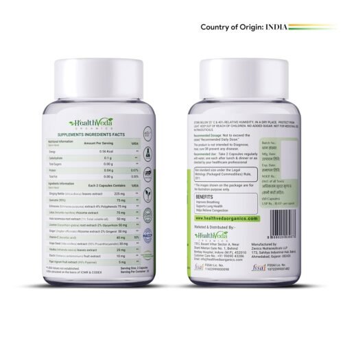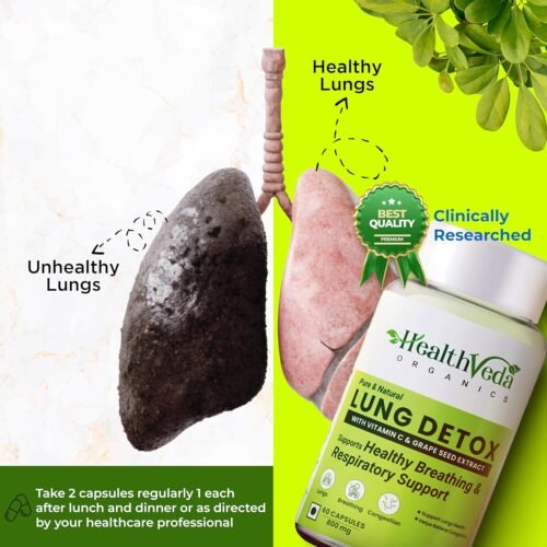 Health Veda Organics Lung Detox Capsules are thoughtfully crafted with natural ingredients like Vitamin C and Grape Seed Extract to support lung detoxification and boost immunity. These 100% vegetarian capsules help cleanse the lungs of toxins and pollutants, promoting clear breathing and overall respiratory health for both men and women.