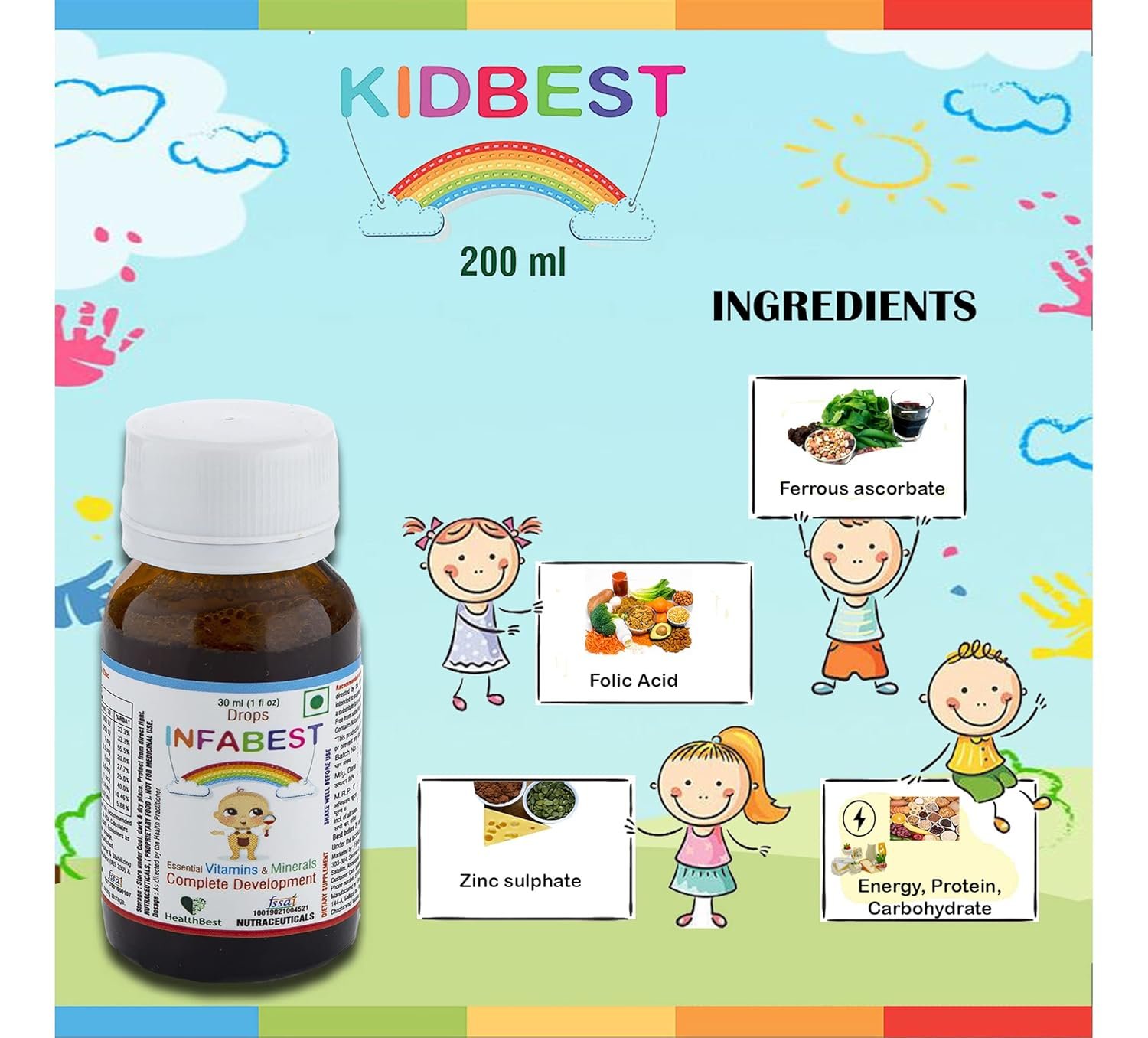 HealthBest Infabest Drops is an ideal choice for parents looking to provide their kids and toddlers with a comprehensive multivitamin supplement to support immunity, growth, and overall development easily and effectively.