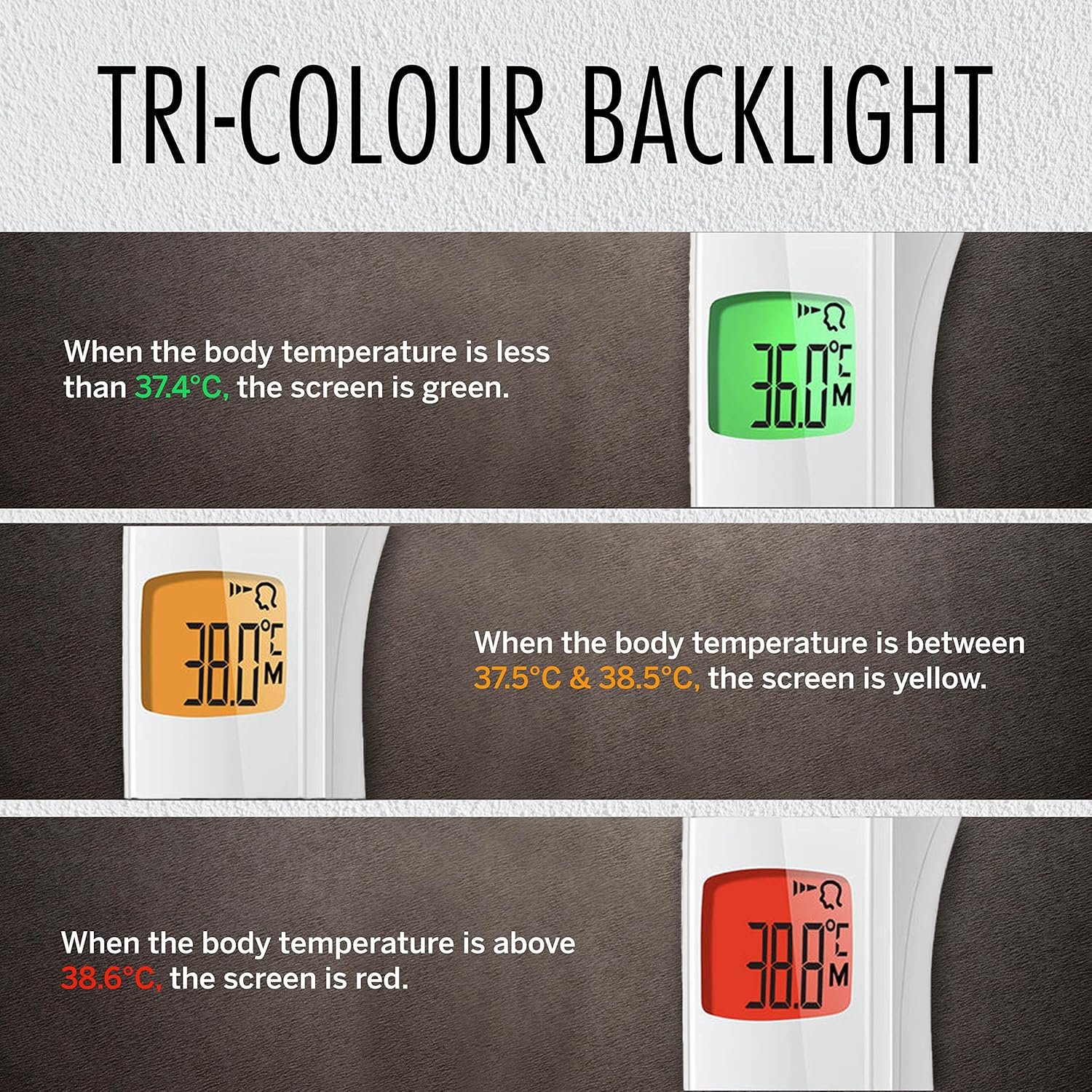✅ Tri-Color Backlight Display: Clear and easy-to-read display with a tri-color backlight (Green, Yellow, Red) to indicate normal, elevated, or high fever temperature levels.