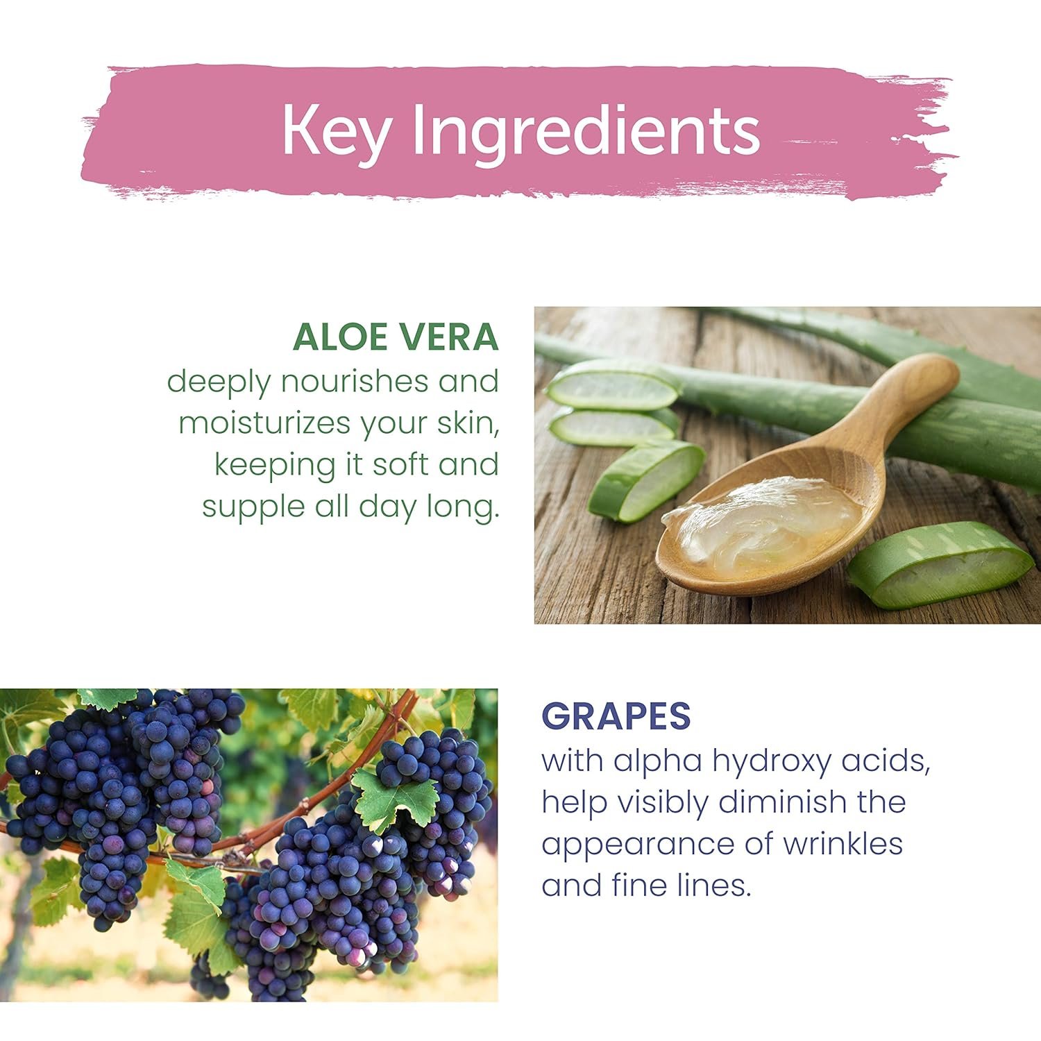 - Aloe Vera & Grapes: Naturally hydrate, rejuvenate, and repair skin.