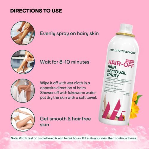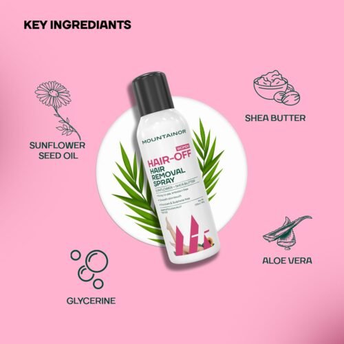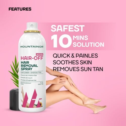 MOUNTAINOR Hair Removal Spray is a painless, natural, and safe solution designed for women to remove unwanted hair from arms, legs, and underarms. This dermatologically tested spray is infused with gentle, nourishing ingredients that ensure an effective hair removal process without irritation or pain. It provides a smooth and flawless finish while also offering detanning benefits, leaving your skin soft, bright, and hair-free.