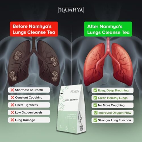 NAMHYA Lungs Cleanse Tea is a premium herbal blend designed to detoxify your lungs and support respiratory health naturally. Crafted with a powerful combination of traditional herbs, this tea helps clear mucus, reduces respiratory discomfort, and aids those looking to quit smoking by promoting lung cleansing and overall vitality.