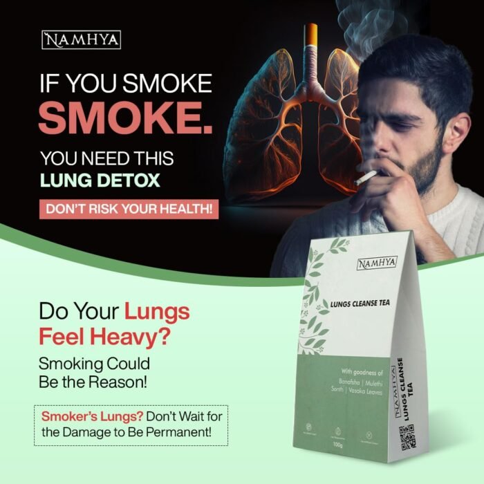 NAMHYA Lungs Cleanse Tea is a premium herbal blend designed to detoxify your lungs and support respiratory health naturally. Crafted with a powerful combination of traditional herbs, this tea helps clear mucus, reduces respiratory discomfort, and aids those looking to quit smoking by promoting lung cleansing and overall vitality.