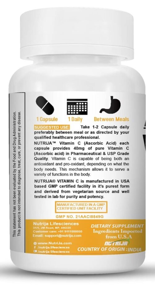 NutriJa Vitamin C/Ascorbic Acid 1000 is a dietary supplement in capsule form designed to support immune health and collagen production. Vitamin C, also known as ascorbic acid, is a water-soluble vitamin with powerful antioxidant properties. It plays a crucial role in several bodily functions, including immune system support and collagen synthesis.