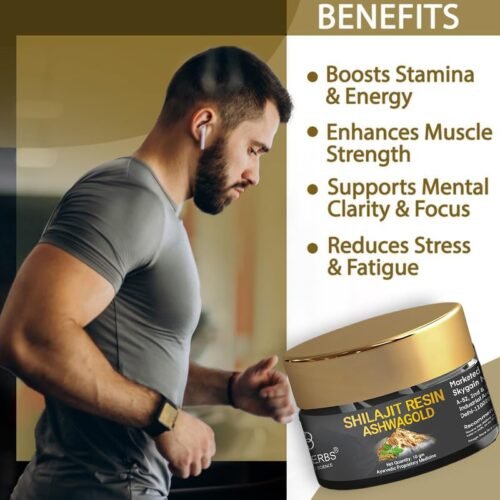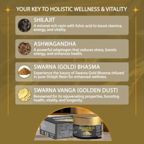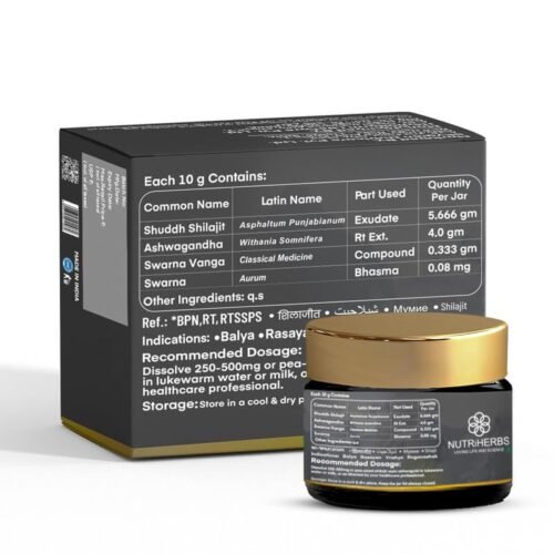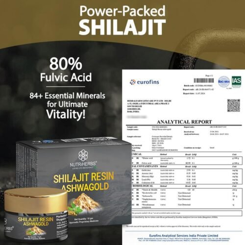 Nutri Herbs Shilajit Resin Ashwagold is a premium Ayurvedic stamina and energy booster made with 100% pure Himalayan Shilajit resin, enhanced with the powerful goodness of Ashwagandha and Swarna Bhasma (Gold Bhasma). This potent combination helps improve physical strength, endurance, muscle growth, and overall vitality in men and women.
