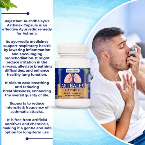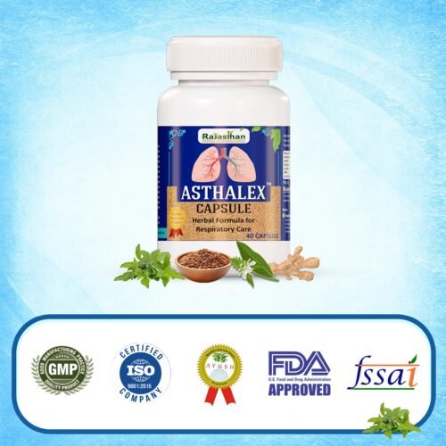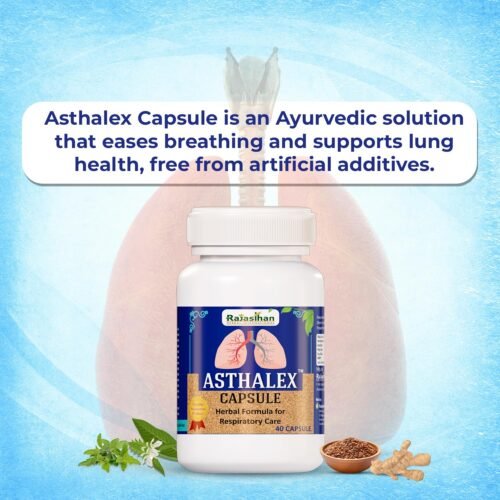 Asthalex Capsule by Rajasthan Aushdhalaya is a traditional Ayurvedic formulation crafted to support respiratory health and improve lung function. Blended with potent herbs, it helps manage conditions like asthma, bronchitis, and congestion by easing breathing, clearing airways, and strengthening the respiratory system naturally.