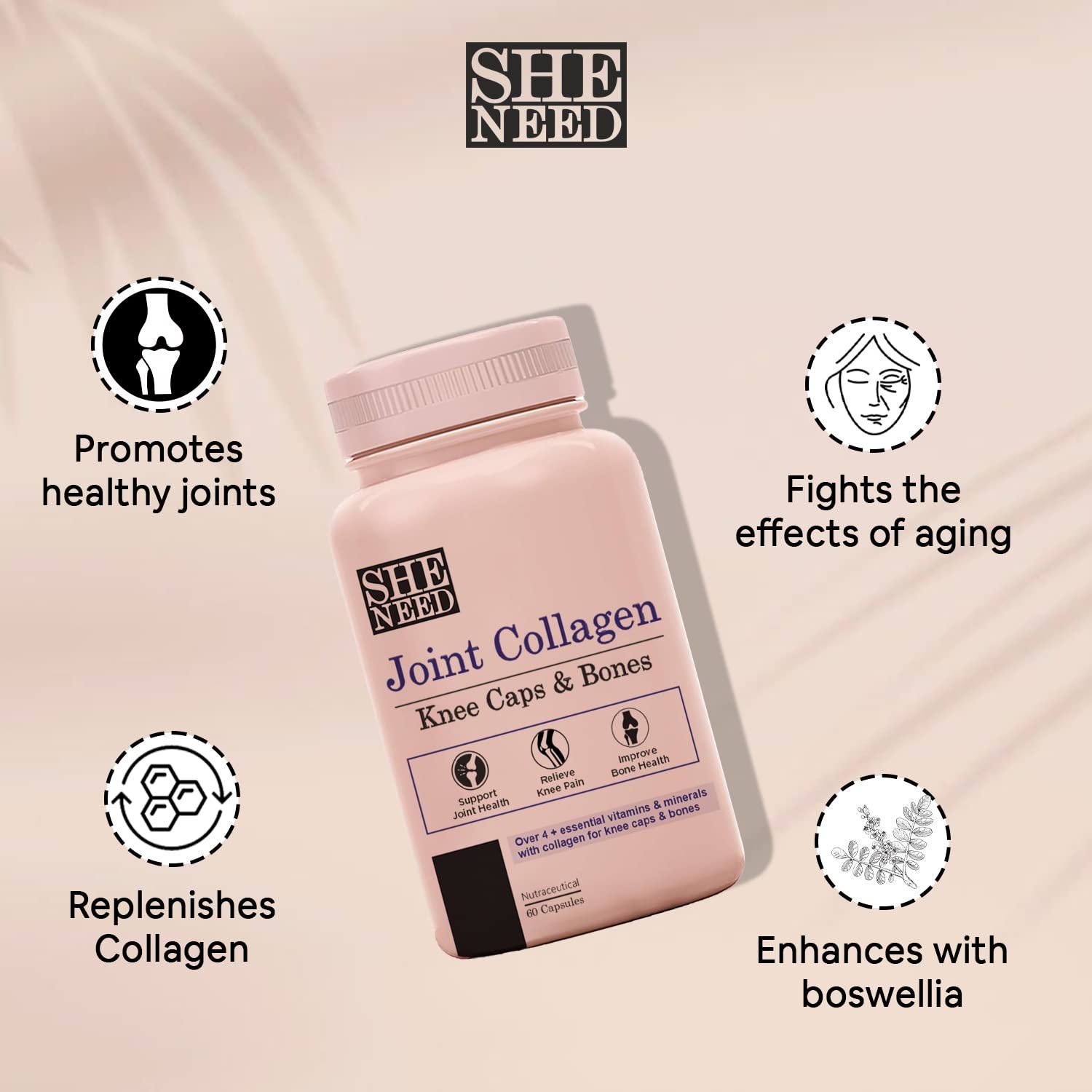 SheNeed Joint Collagen for Knee Caps & Bones & Joint care with Hydrolyzed Type-ll Collagen with Hyaluronic acid, Glucosamine, Vitamin-D with Amino-Acid – 60 capsules
