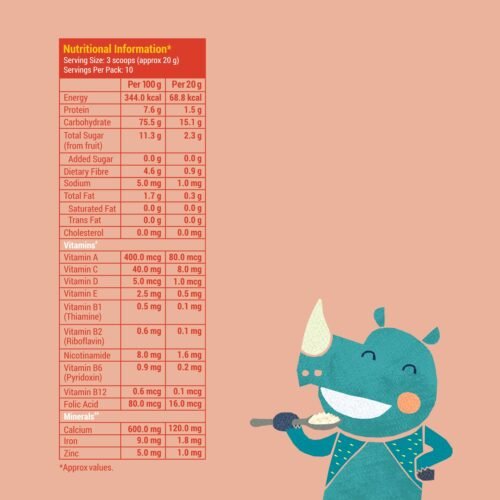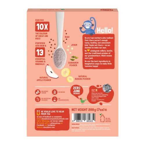 - Ingredients: Ragi (finger millet), apple powder, banana powder, and nothing else!