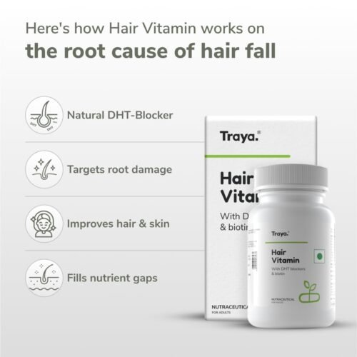 The Traya Hair Growth Supplements Combo is a comprehensive hair care solution designed to promote healthy hair growth, combat hair fall, and improve overall hair quality. The combo includes Hair Ras tablets (120 tablets) and Hair Vitamins (30 tablets). Formulated with 12 mcg of Biotin, Ashwagandha, and other potent ingredients, this duo works synergistically to nourish the scalp, strengthen hair follicles, and improve hair texture for visible results.