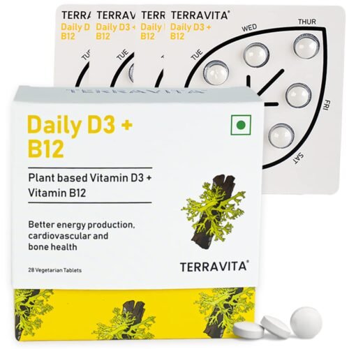 TERRAVITA Daily Vitamin D3 + Vitamin B12 Supplement Plant-Based D3 & B12 Vitamin Tablets for Better Energy Production, Heart & Bone Health. Inhabit-Friendly Weekly Strips – 28 Tablets