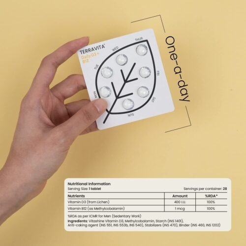 - Inhabit-Friendly Weekly Strips: Each box of TERRAVITA Daily Vitamin D3 + Vitamin B12 Supplement contains 28 tablets conveniently packaged in inhabit-friendly weekly strips, making it easy to incorporate into your daily routine. Simply pop out a tablet for each day of the week and take it with your morning routine.