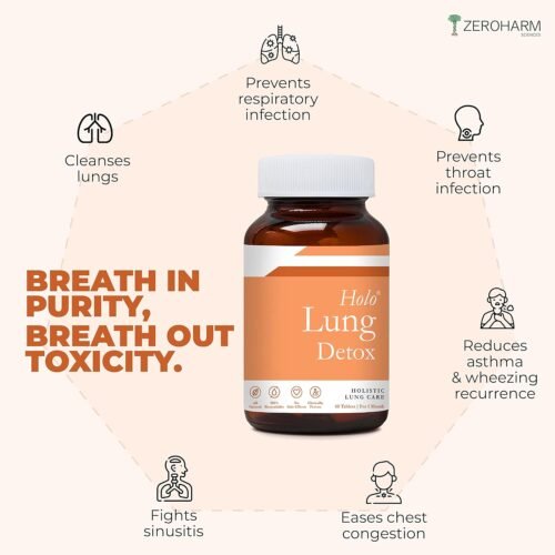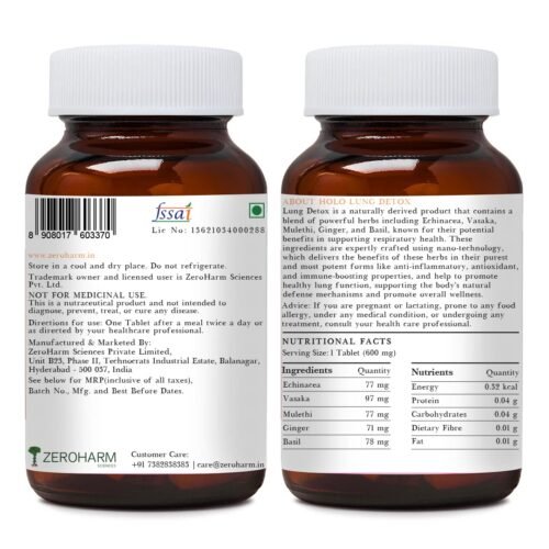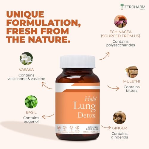 ZEROHARM Holo Lung Detox Tablets – Ayurvedic Lung Cleanse for Pollution, Smoking & Respiratory Health – With Vasaka, Echinacea, Ginger, Basil, Mulethi – Nano Technology for Men & Women – 60 Tablets
